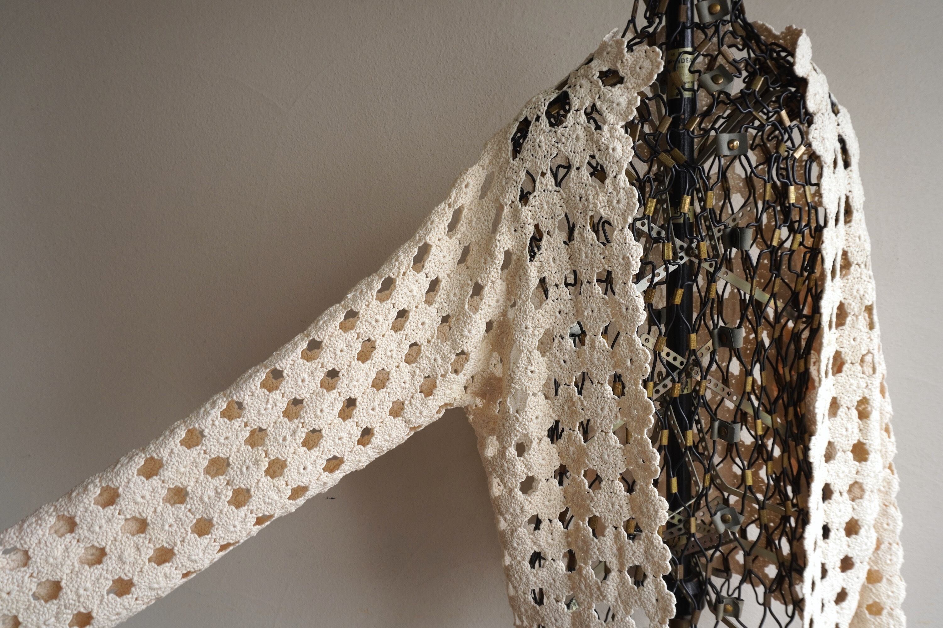 1990's〜 クロシェニットカーディガン オープンフロント アイボリー 実寸(women's M〜L程度) レース編み ヴィンテージ
