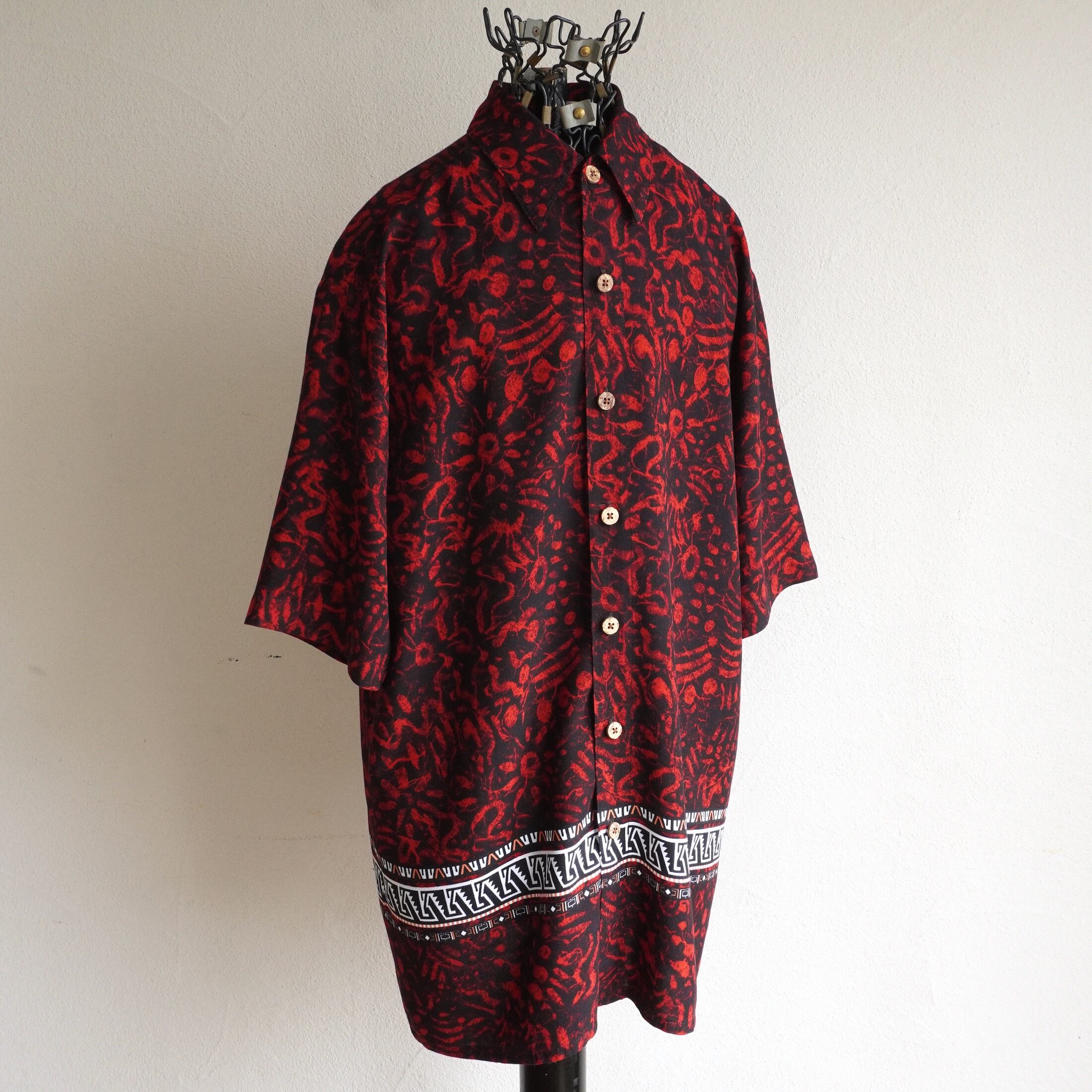 1990's [puritan] エキゾチックパターン×トライバル調ライン 100%レーヨン S/S リゾートシャツ ブラック×レッド 表記(men's S) ハワイアン アロハ ヴィンテージ | MAGNOLIA WEBSTORE