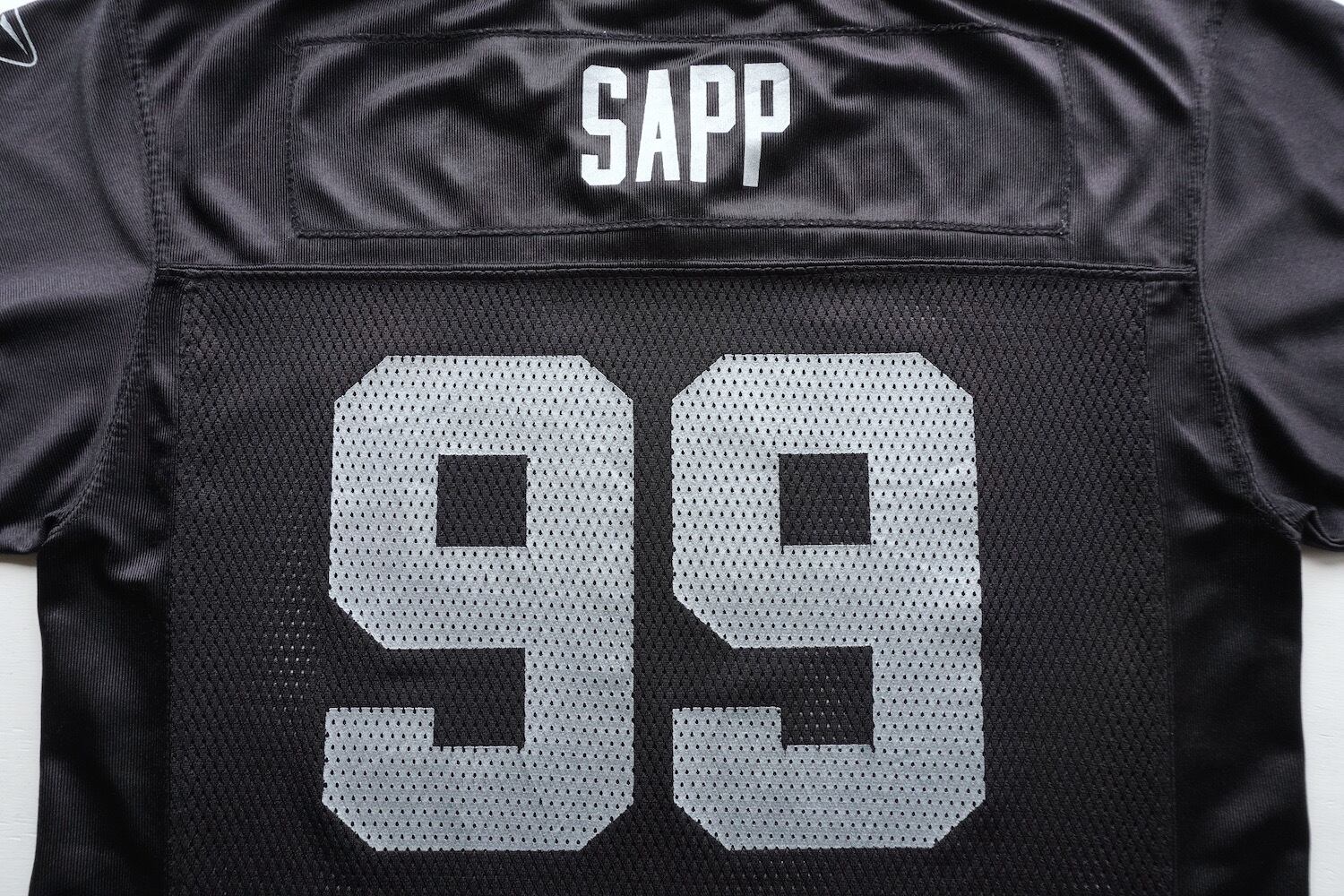 NFL「RAIDERS」#99 "SAPP"モデルのメッシュフットボールゲームジャージー。