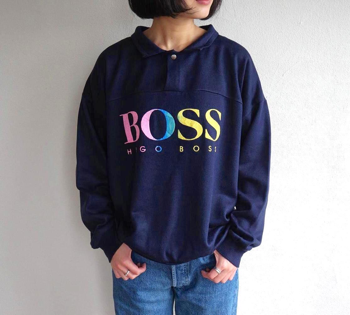 1990’s [HUGO BOSS] 襟&スナップボタン付 プルオーバースウェット ネイビー 実寸(L位) ヒューゴボス