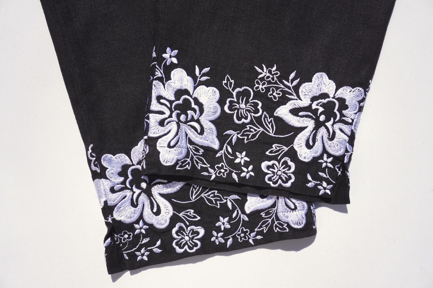裾のフローラル刺繍がアクセントになった、シック且つ夏らしいルックスのサマーパンツ。