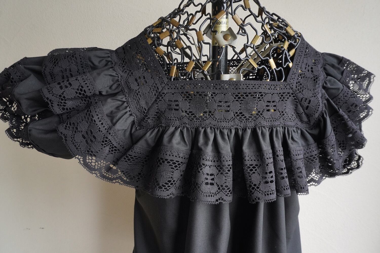 1970's〜 USA製 [SQUARE UP FASHIONS,INC.] クロシェレースラッフル ペザントトップ ブラック 表記(women's S) ブラウス フリル BOHO ゴシック ヴィンテージ