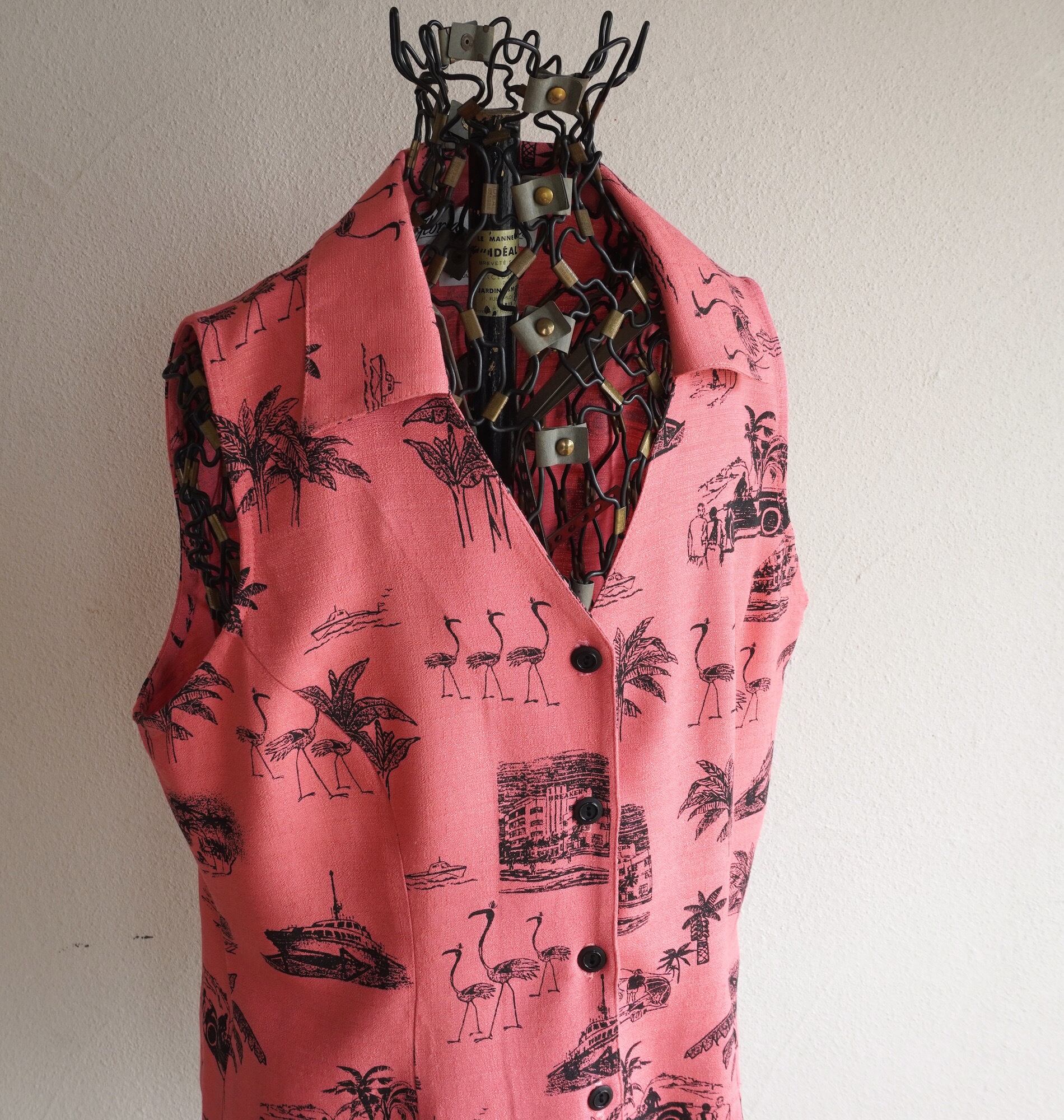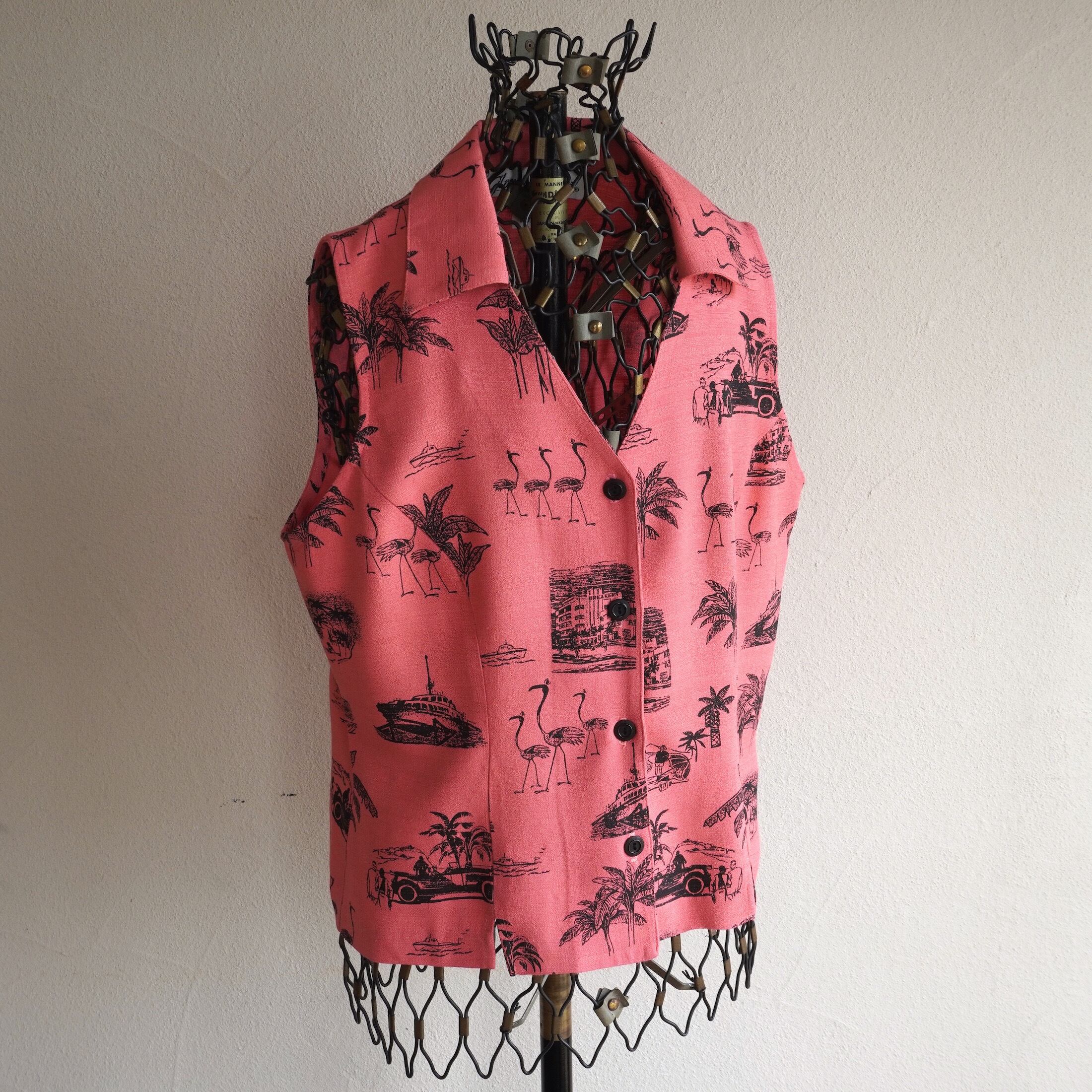 色味の良いコーラルピンクにリゾートプリントが可愛い、スリーブレスサマーブラウス。
