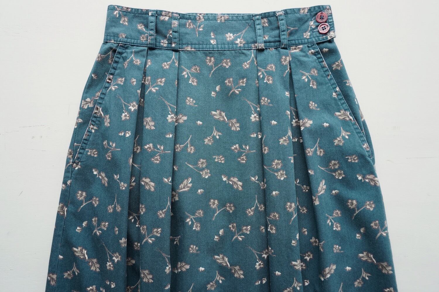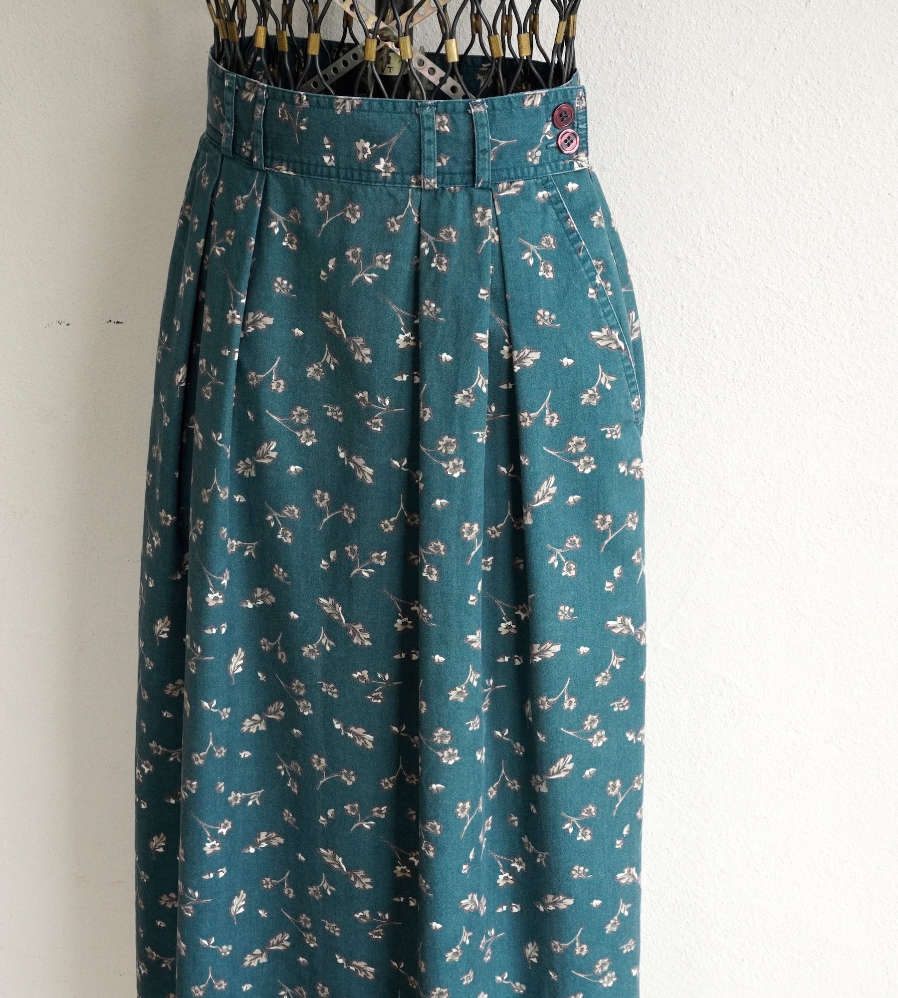 色味の良いティールグリーンに小花柄が可愛い、Aラインロングスカート。
