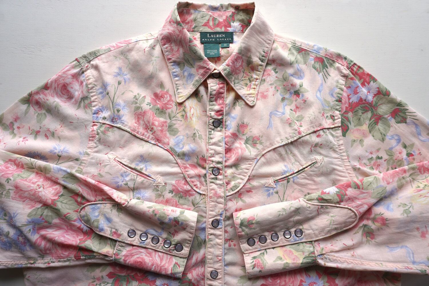 1990's [LAUREN] フローラルプリント L/S コットンウエスタンシャツ ベビーピンク 表記(women's 1X) ラルフローレン ヴィンテージ
