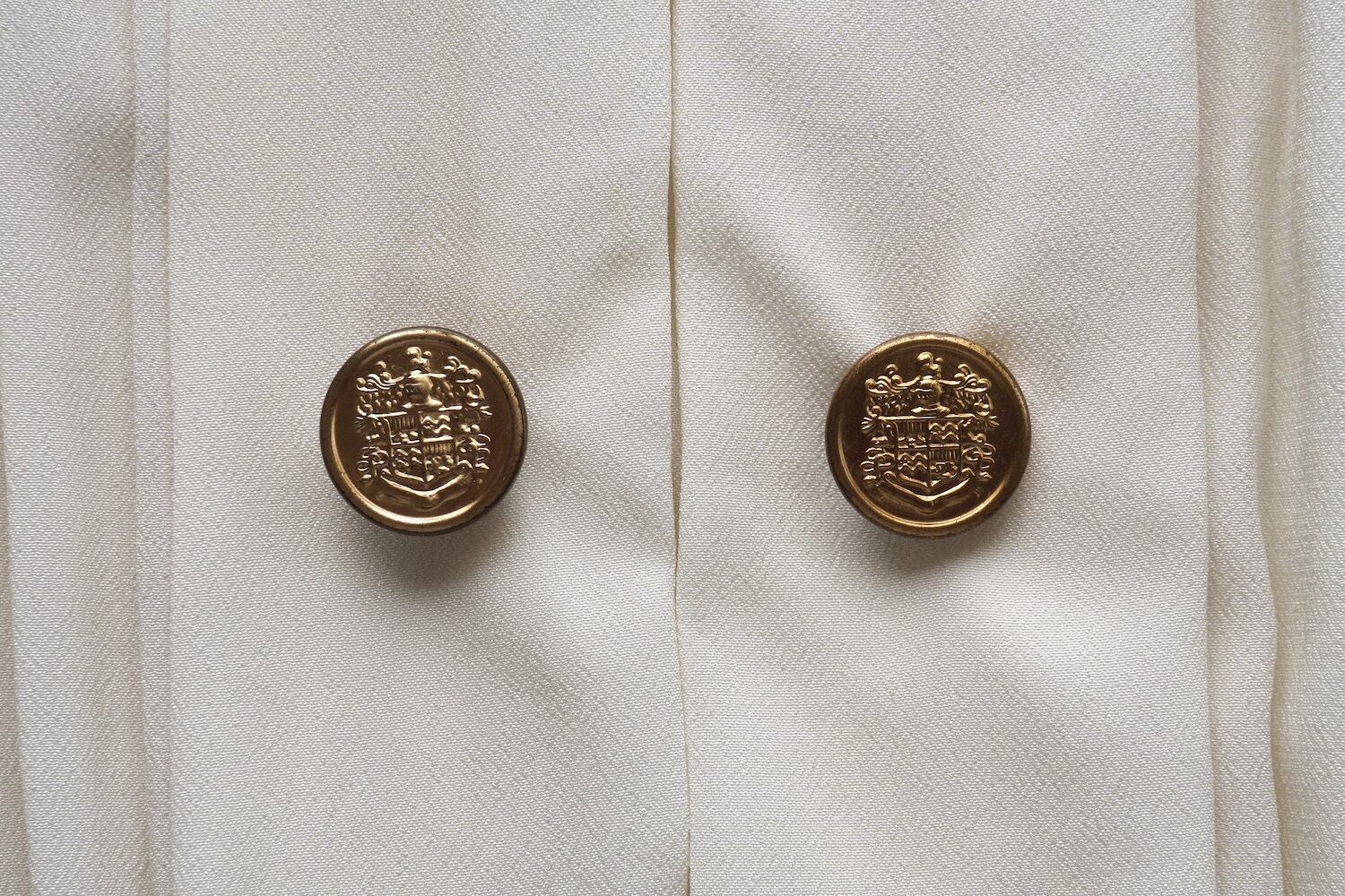 プリーツデザインに金ボタンが可愛い、L/Sプルオーバーブラウス。