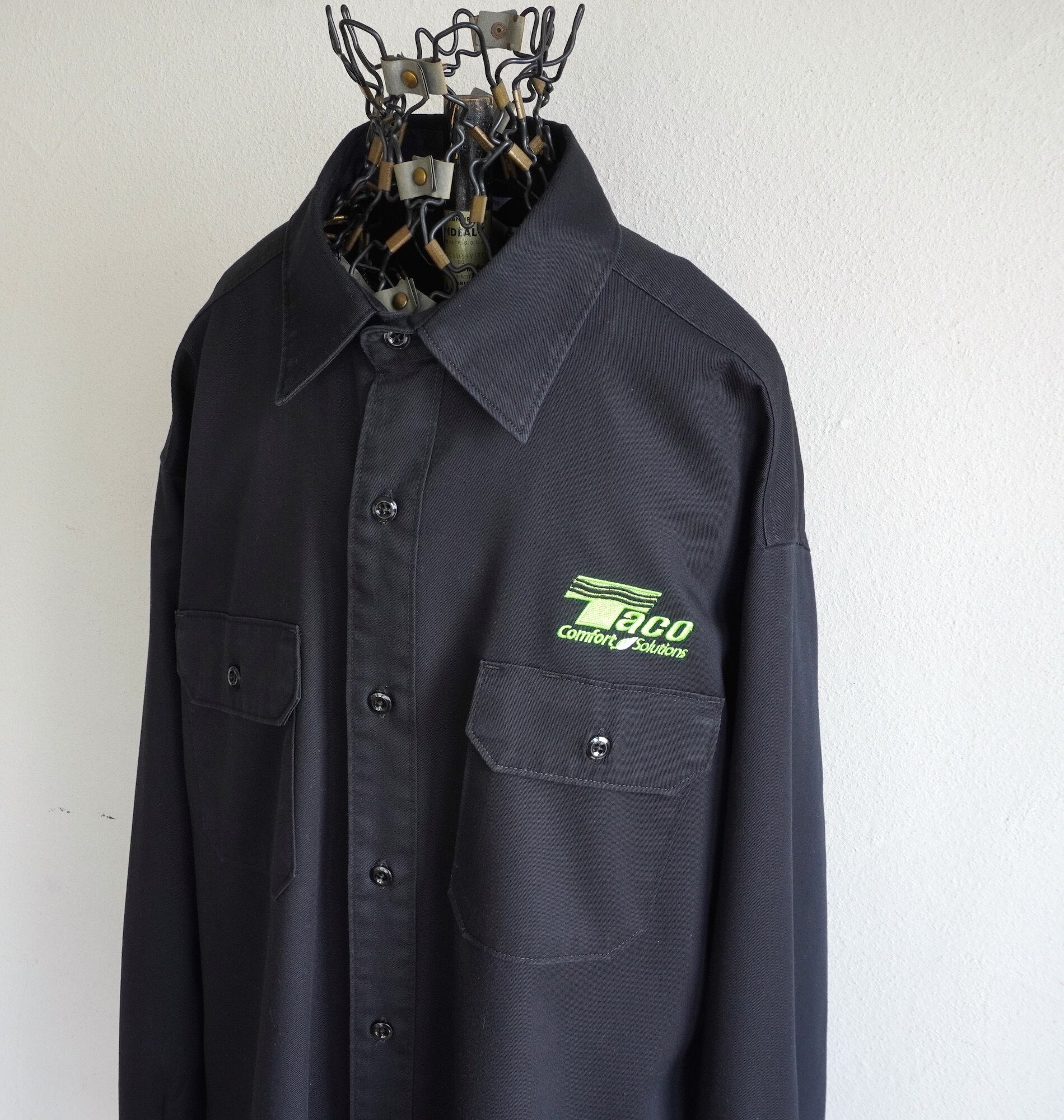 ブラックにネオングリーンの企業ロゴ刺繍が好アクセントの、L/Sワークシャツ。