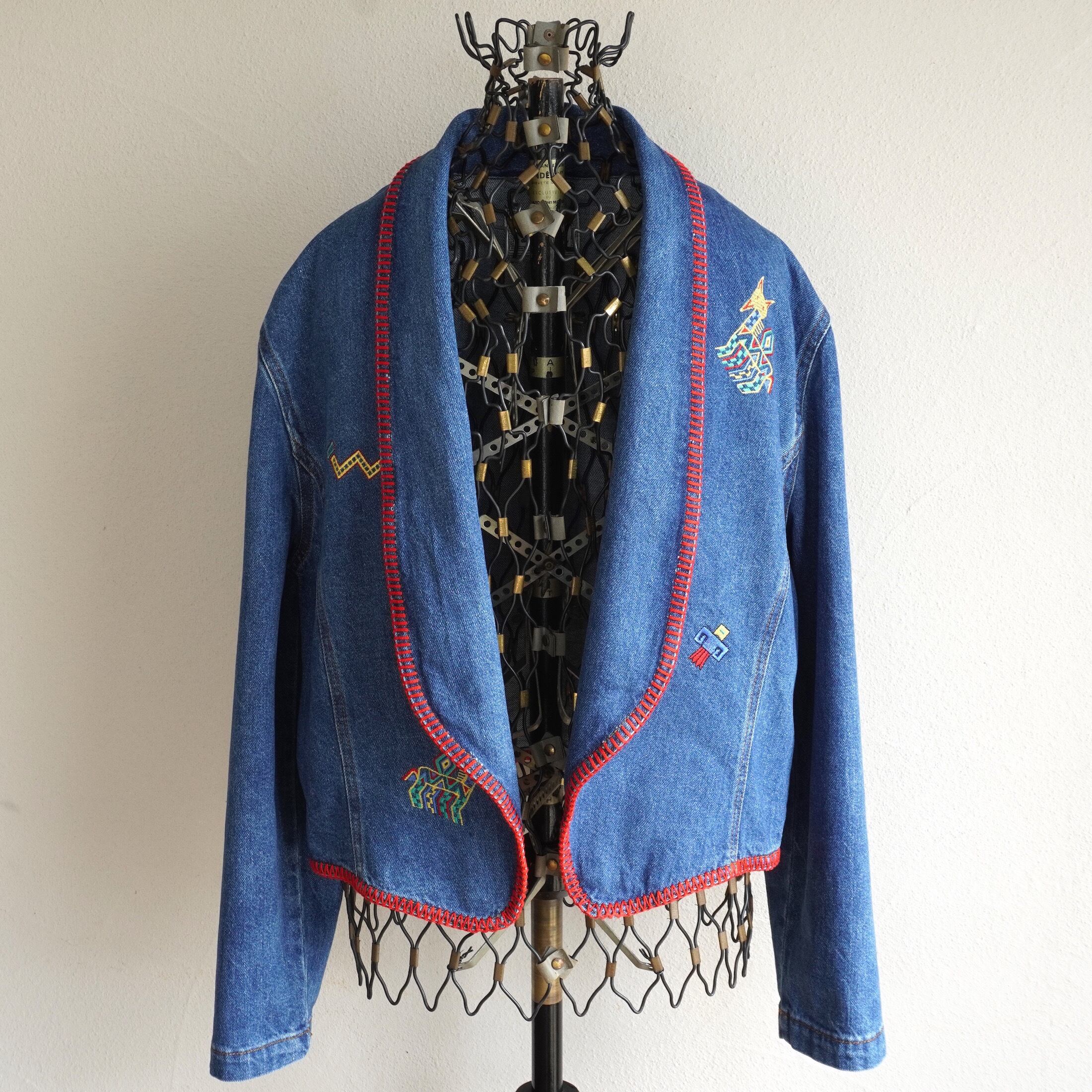 1990's USA製 [Rickie] ネイティブ調刺繍 ショールカラー&ショート丈 フロントオープン ウエスタンデニムジャケット ブルー 表記(women's M) ヴィンテージ