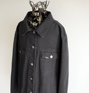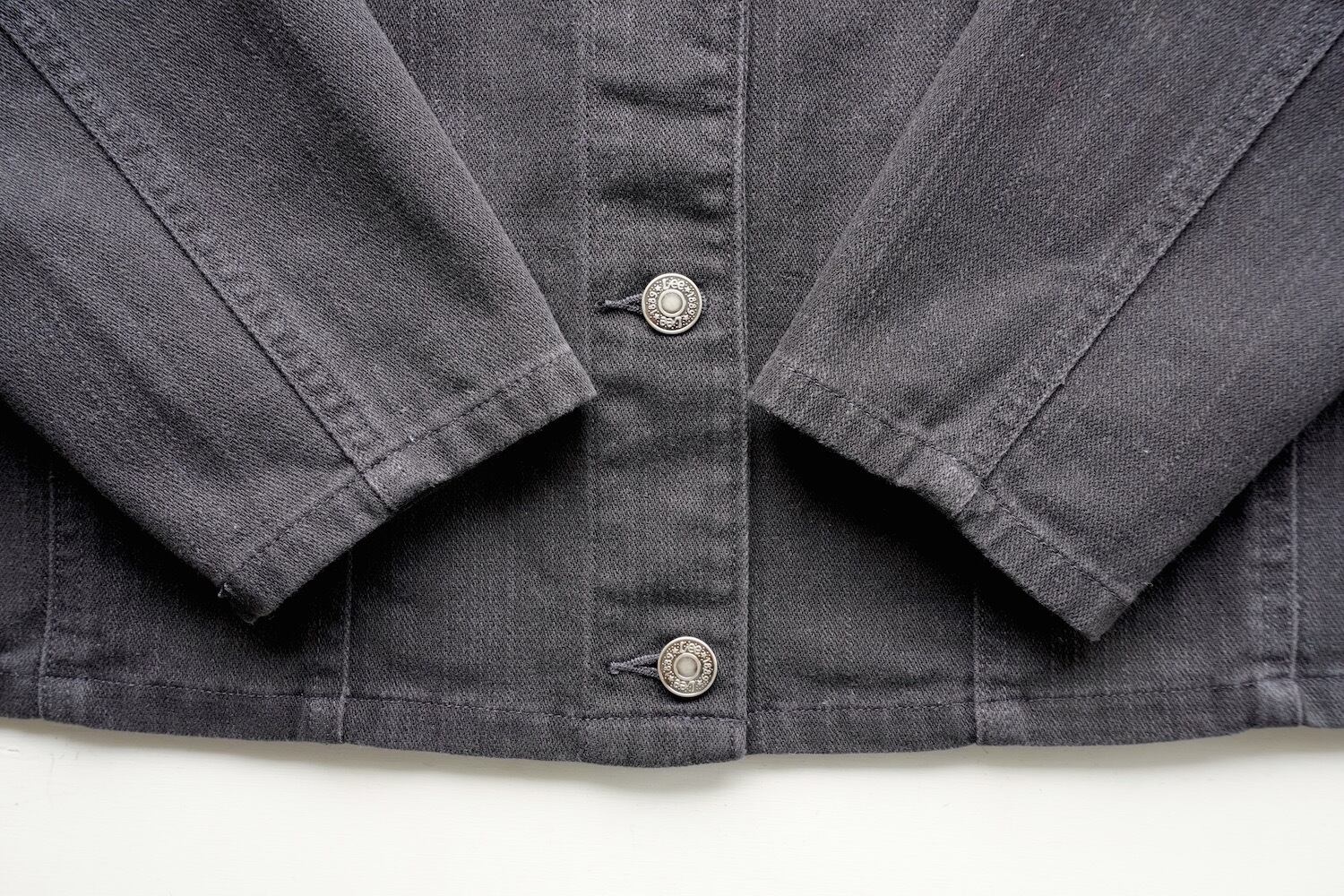 袖カフ・ウエストバンドが無いスッキリしたデザインの、ブラックデニムトラッカージャケット。