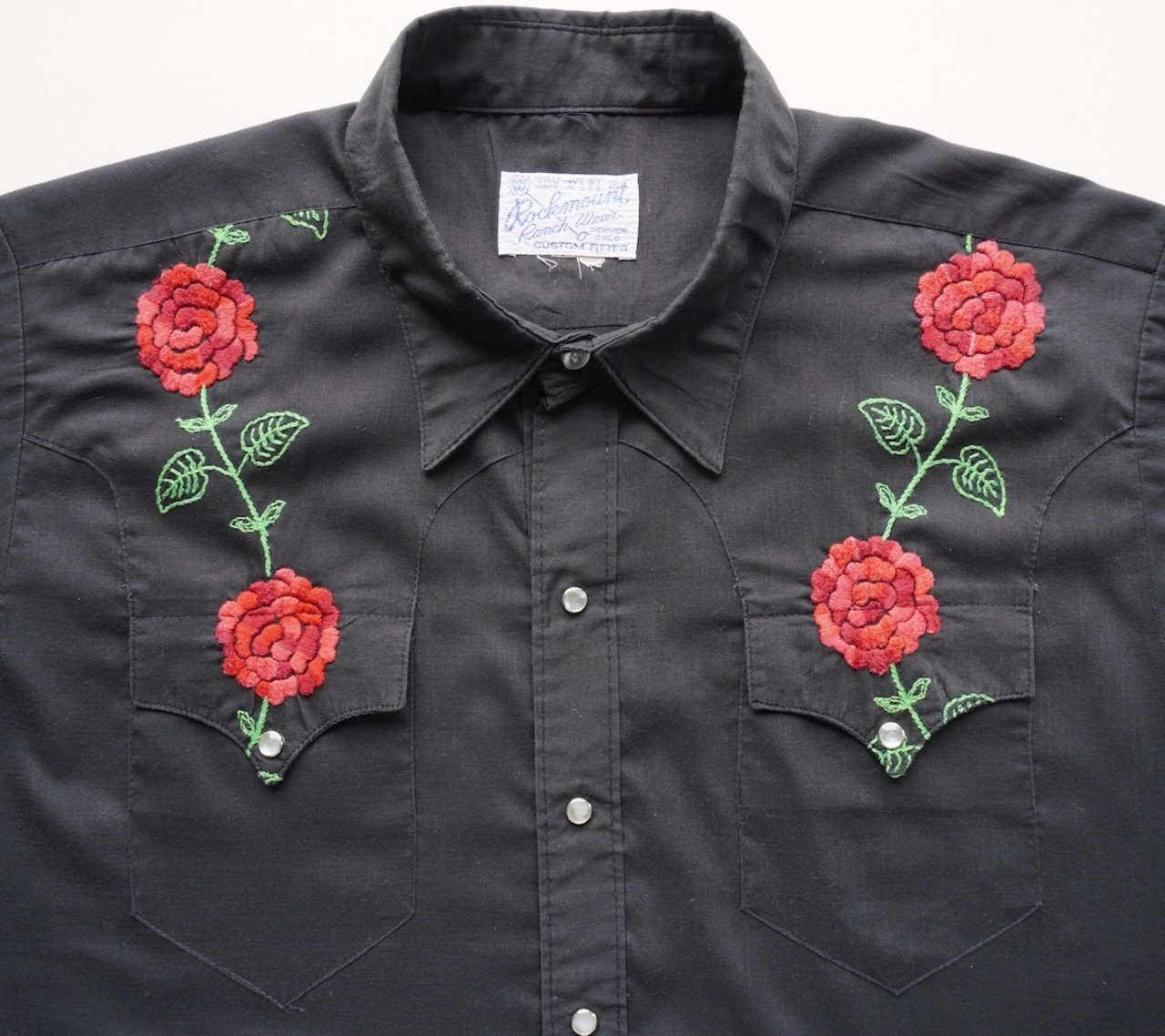 1970's〜80's USA製 [Rockmount] 薔薇刺繍 L/S ウエスタンシャツ ブラック 実寸(men's L〜XL程度) CUSTOM FITTED ローズ フローラル ロックマウント ヴィンテージ