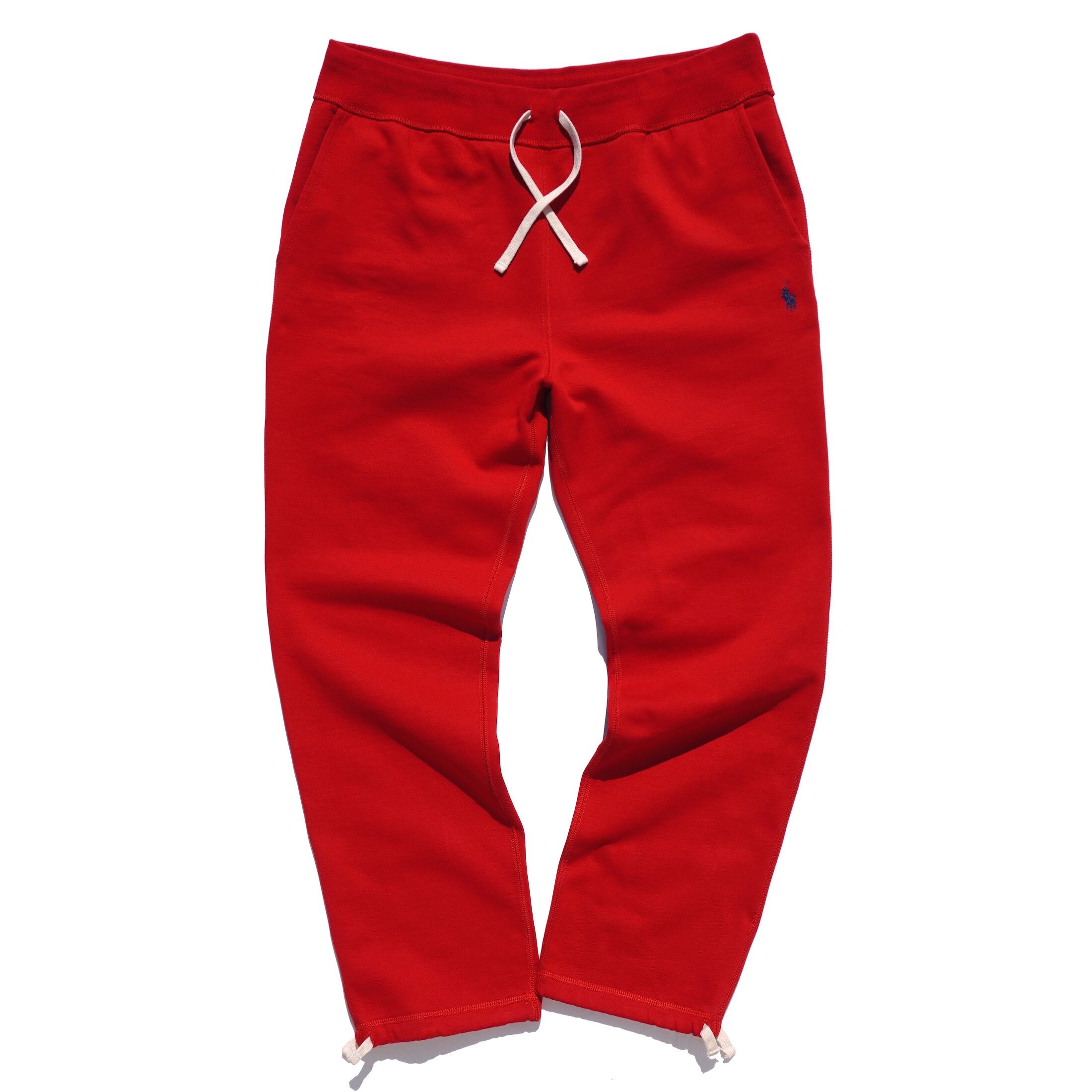 ビビッドなレッドにネイビーのワンポイントポニー刺繍がアクセントの、スウェットパンツ。