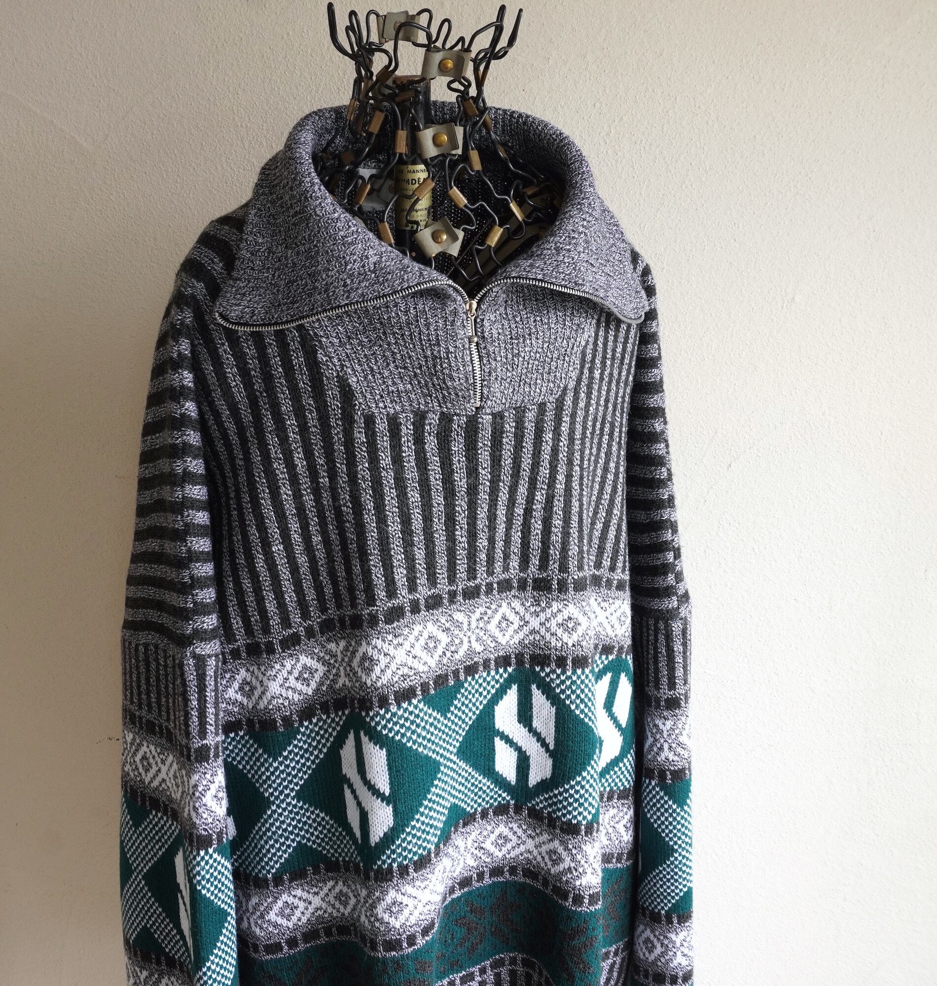 1980's ユーロ ハーフジップ オフタートルネック デザインニットセーター ヘザーグレー 実寸(men's XXL程度) ヨーロッパ ヴィンテージ