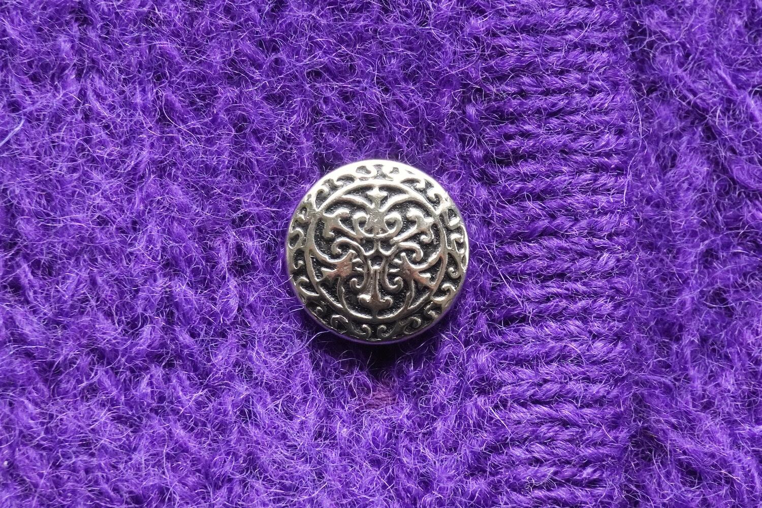 鮮やかなパープルに、シルバー(色)のスカルプチャーボタンがアクセント。