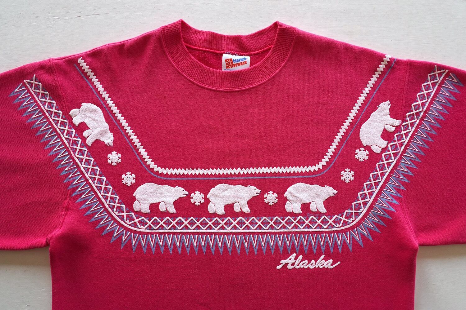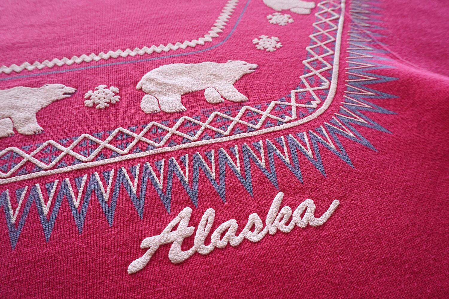 1990's USA/MEXICO製 [Hanes] ポーラーベア ノルディック調フォームプリント Alaska スーベニアスウェット ピンク 表記(men's M) アラスカ シロクマ アニマル ヴィンテージ