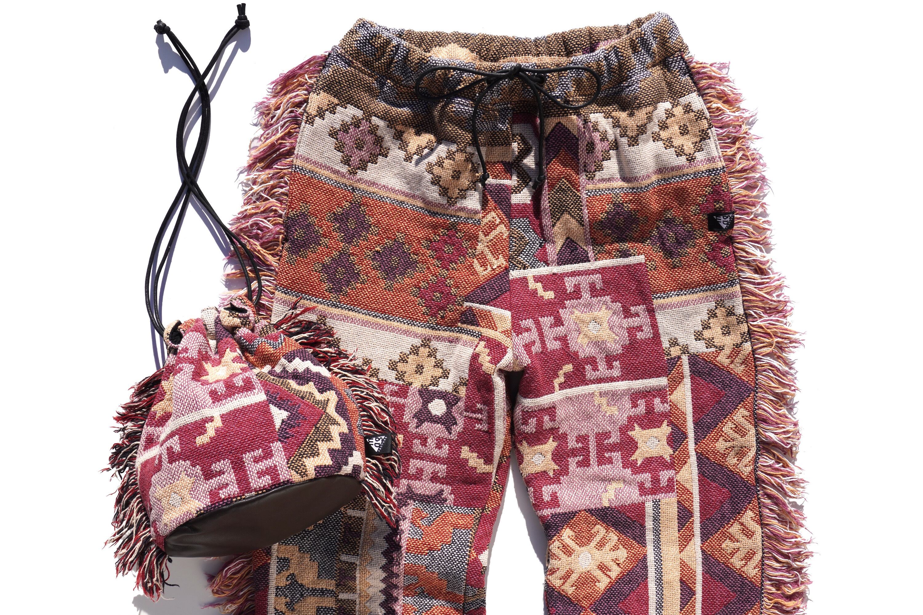 美しいルビー色のキリム柄に、レザーボトムが上品な印象。