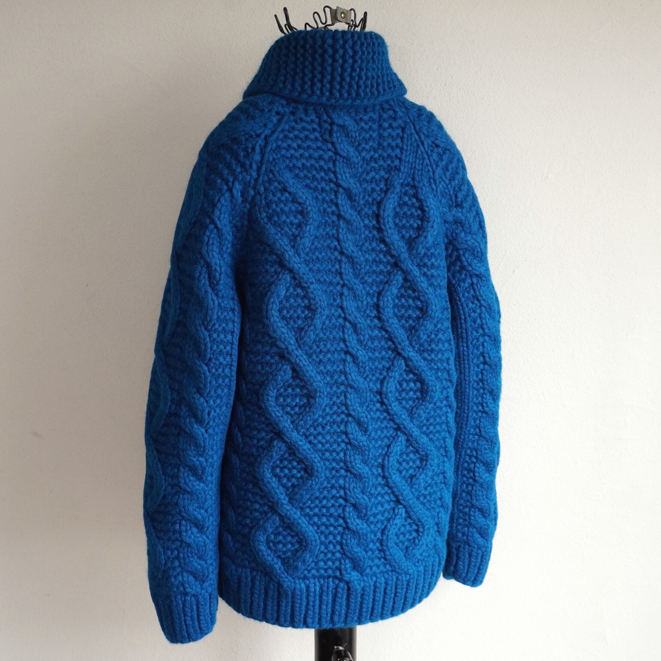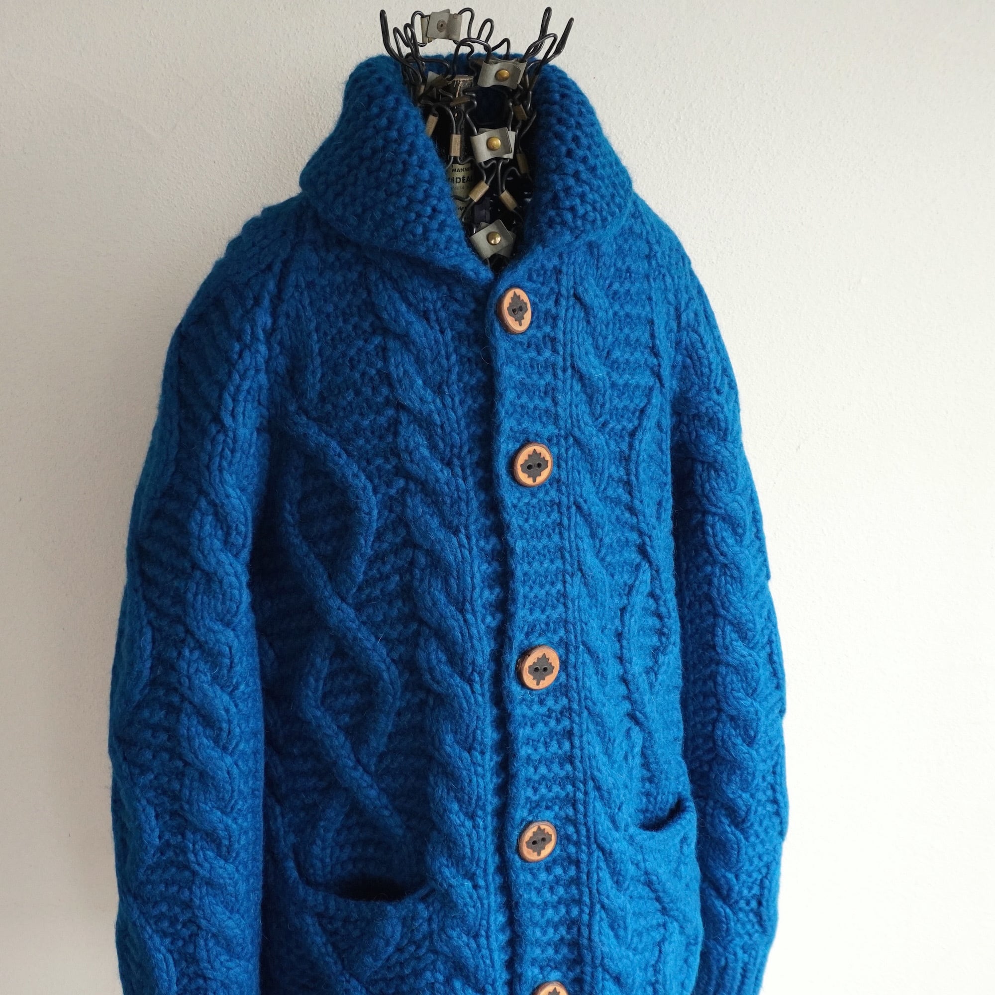 2000's〜 CANADA製 [Kanata] ダイヤモンド&ケーブル アラン模様 カウチンセーター ブルー 実寸(men's M程度) ショールカラー ハンドニット カナダ ヴィンテージ