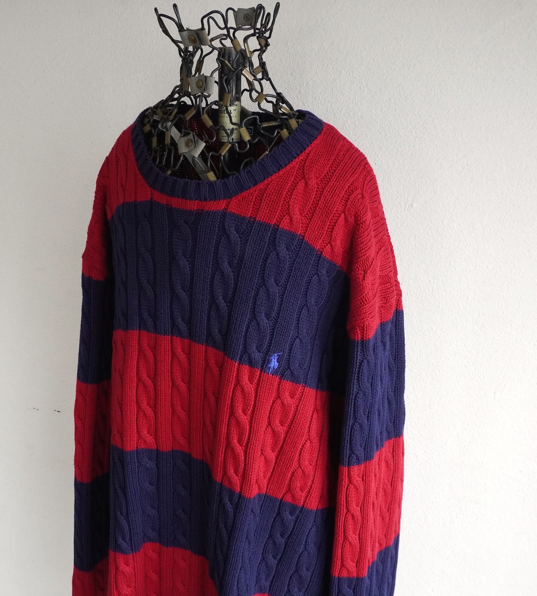 1990's [Polo by Ralph Lauren] ワイドボーダー柄 100%コットン ケーブルニットセーター クルーネック ネイビー×レッド 表記(XXL) ラルフローレン オールド ヴィンテージ