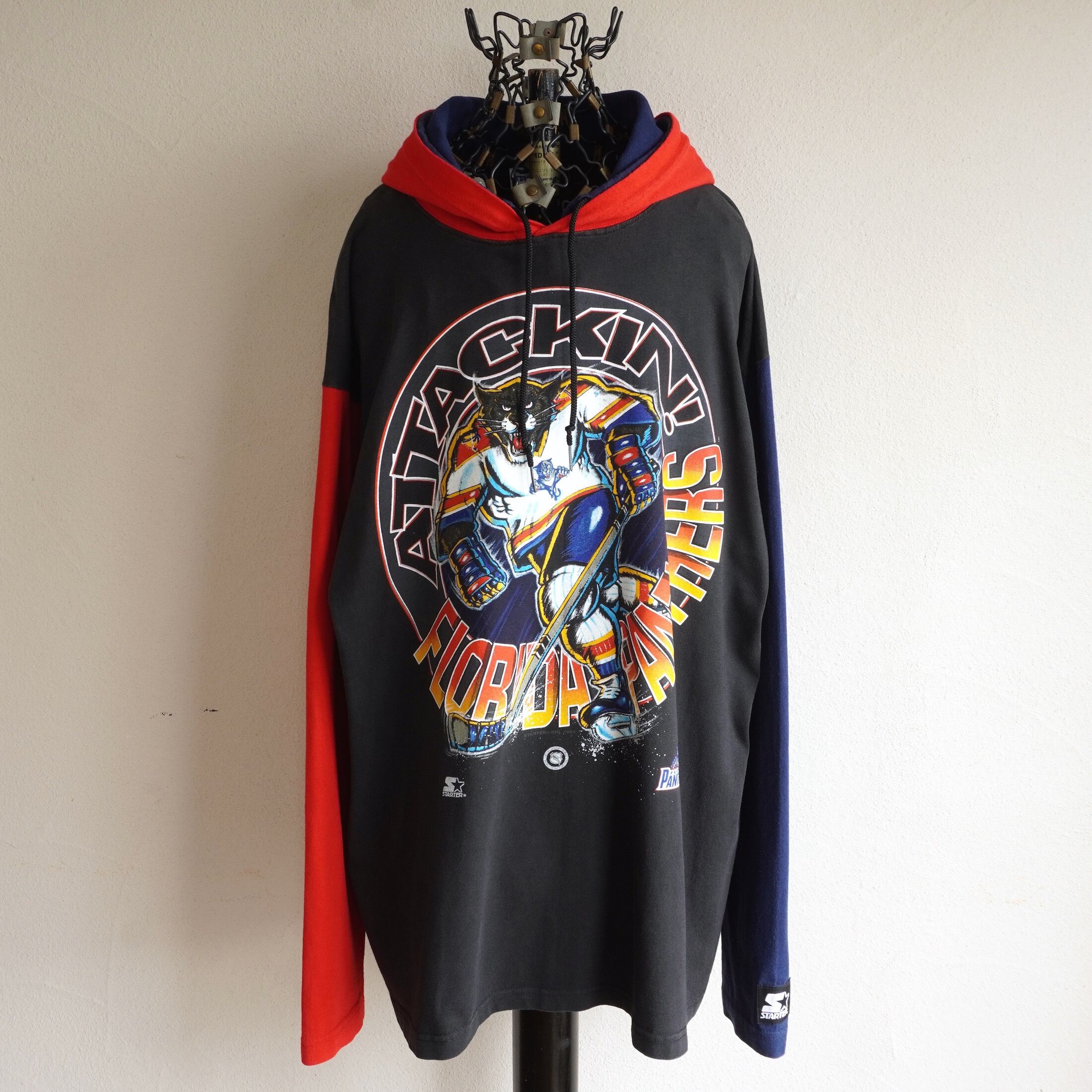 1990's USA製 [STARTER] NHL "FLORIDA PANTHERS" ダブルフード L/S Tシャツ ブラック×レッド/ネイビー 表記(men's L) マルチ クレイジー フロリダ・パンサーズ スターター ヴィンテージ